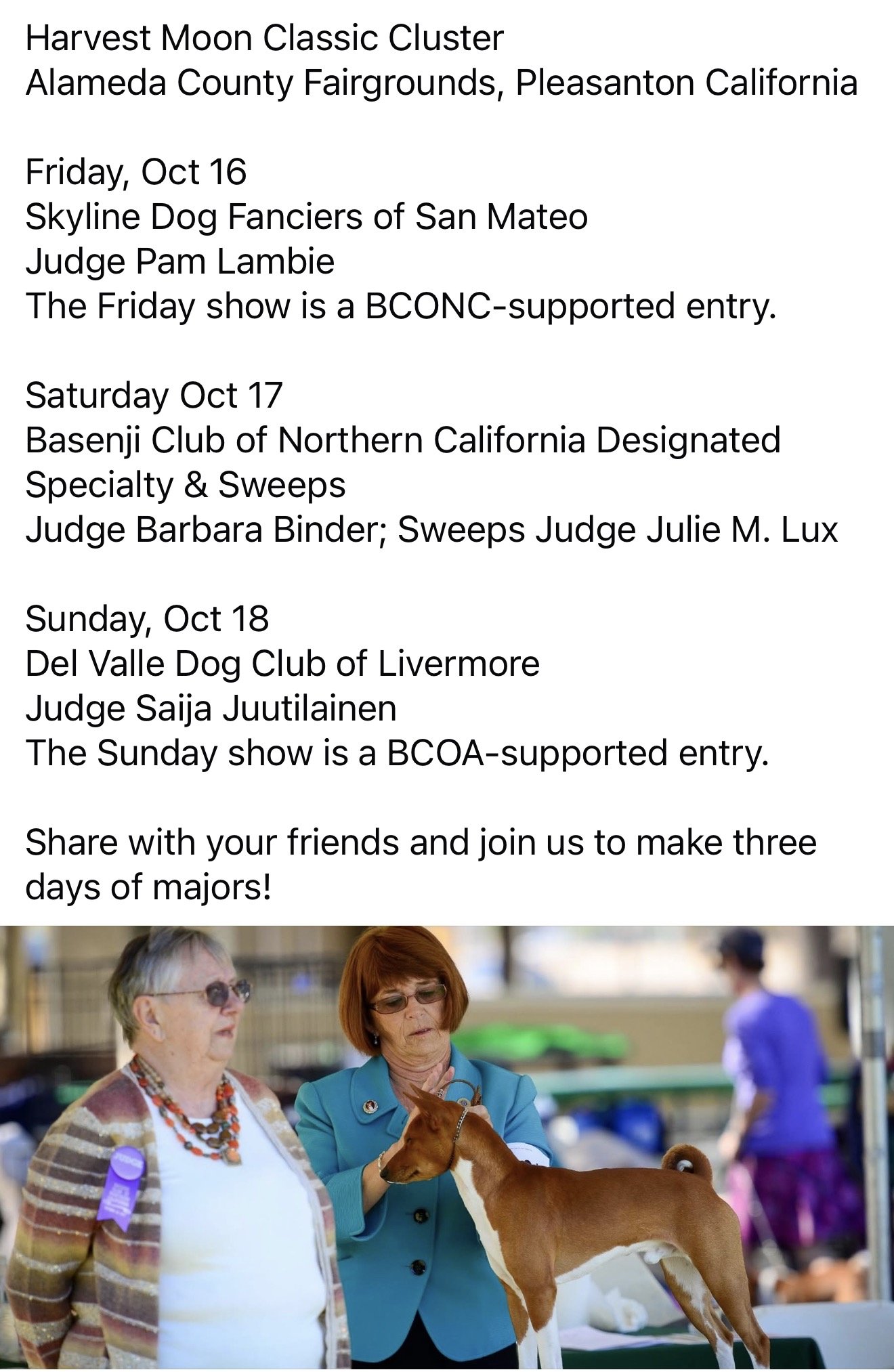 Saturday is a BCONC specialty & sweepstakes (Anne Martin will judge sweeps)